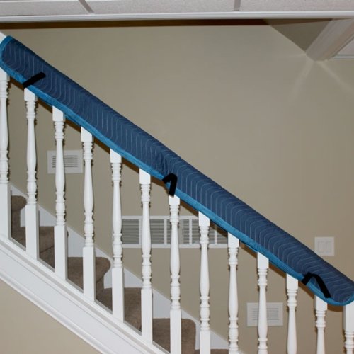 This 13" x 72" quilted banister cover is designed to protect expensive railings while moving items up and down stairs. It is made of a durable microfiber fabric and the filler is a thick recycled cotton batting. It features 3 hook & loop straps to secure around most banisters or railings.